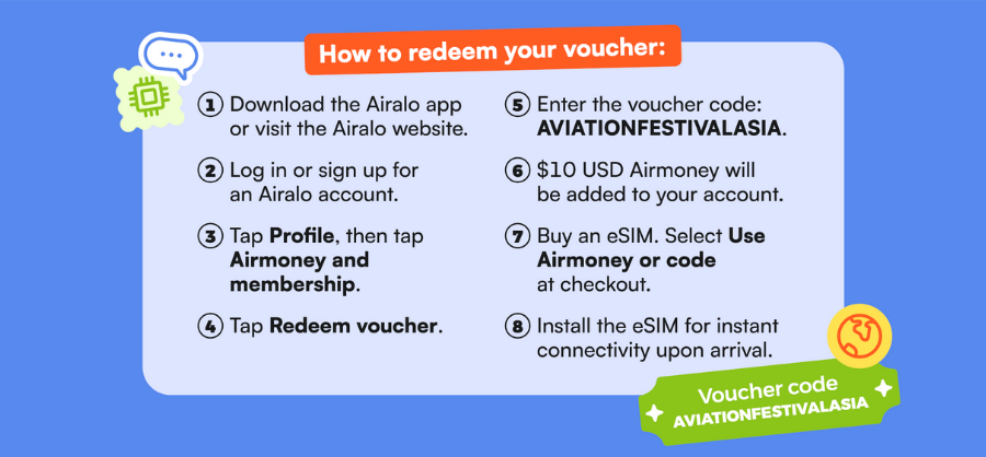 Attendees of Aviation Festival Asia can enjoy a $10 voucher from our Global eSIM Partner, Airalo. Simply use the promo code AVIATIONFESTIVALASIA when adding money to your Airalo account.