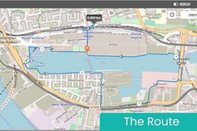 The 5km route starts at the West Terrace of ExCeL and loops around the Royal Victoria Dock passing Dock Beach, residential areas, and back to the West Terrace.